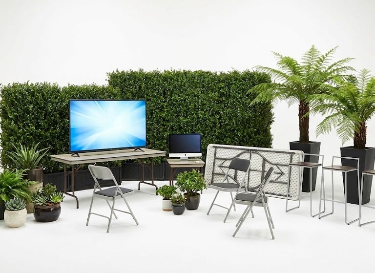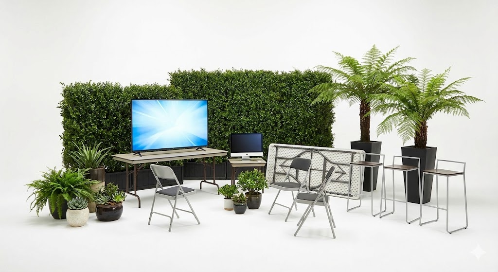 A collection of event essentials designed to transform any venue into a professional and inviting environment. This inventory includes a full range of furniture from folding tables and barstools to comfortable seating, paired with high-definition TVs and monitors for high-impact digital branding. To define and soften your layout, we provide a curated greenery collection featuring potted plants, large fern "trees," and modular bush wall dividers that offer both organic style and functional space management.